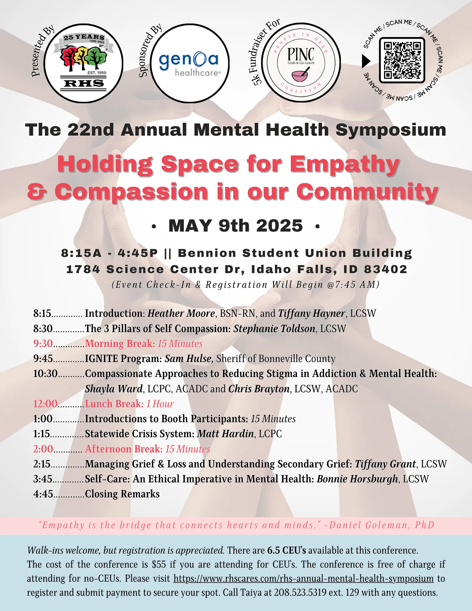 The RHS Mental Health Symposium offers CEUs to its attendees and offers a wide range of education, resources, and connections. Prominent speakers, both local and national, in fields such as mental health, medical health, safety, holistic health, child care, housing, law, and much more, present every year. This is a wonderful event for mental and medical health workers, law enforcement, students, and everyone in between.